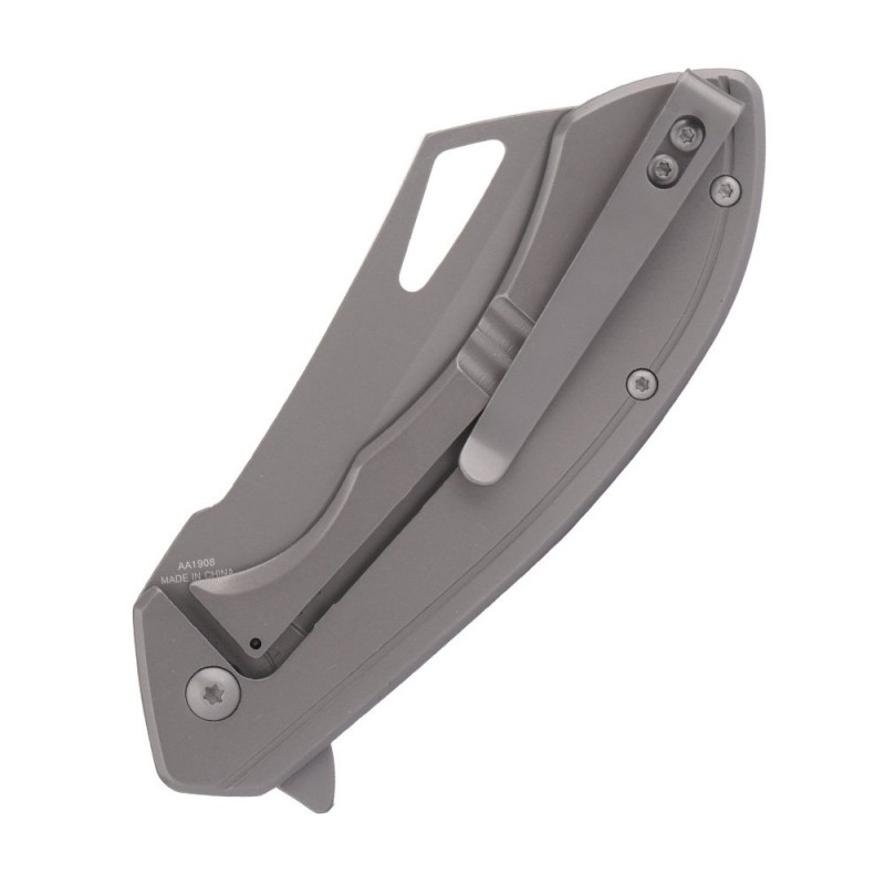 Placa de prindere din otel inoxidabil acoperita cu un strat de nitrura de titan este neteda si usor profilata pentru a sta confortabil in mana. Cutitul este echipat cu o clema care ii permite sa fie purtat intr-un buzunar al pantalonilor, care poate fi transformat in partea preferata.