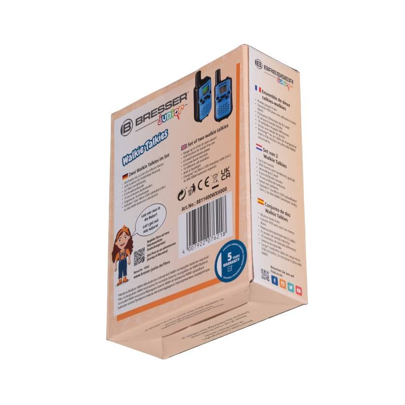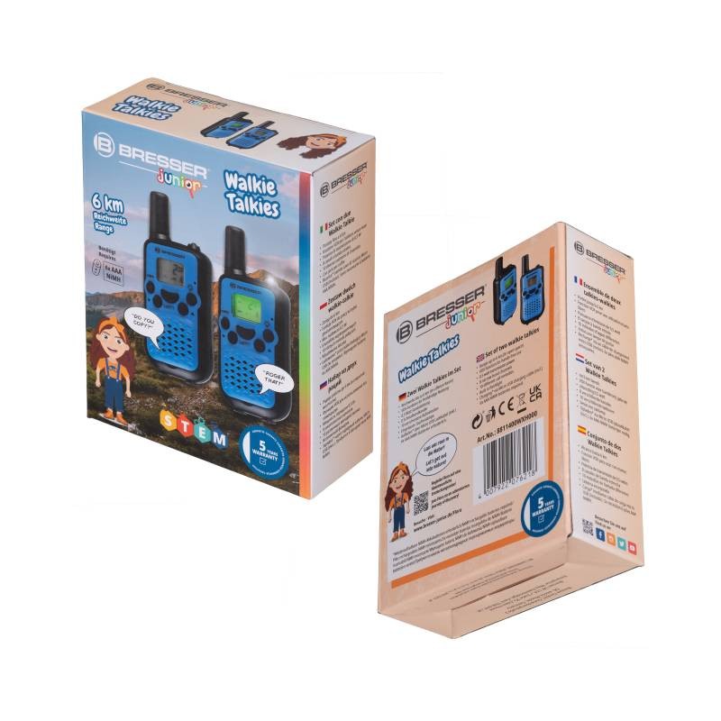 Avand o greutate redusa si dimensiuni compacte, walkie-talkie BRESSER JUNIOR este special conceput pentru mainile mici. De asemenea, au un meniu intuitiv care poate fi controlat folosind cele 5 butoane. Daca aveti nevoie sa va pastrati mainile libere pentru investigatii ulterioare sau pentru jocuri in aer liber, puteti atasa walkie-talki-urile la jacheta, blugi sau rucsac folosind clemele pentru curea si activati functia maini libere. Dispozitivele se vor porni automat atunci cand vorbiti.