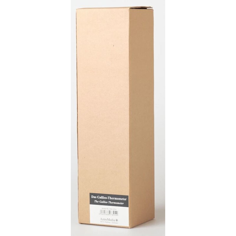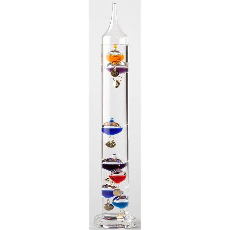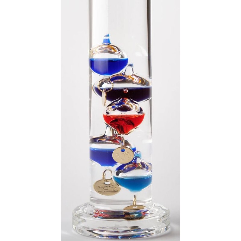 Cum functioneaza: Acest termometru functioneaza pe principiul descoperit de Galileo ca densitatea unui lichid se modifica pe masura ce temperatura variaza. Fiecare dintre bile de sticla este exact cantarita prin umplerea partiala a sferelor cu lichid. Cand temperatura creste, lichidul din cilindrul de sticla devine mai putin dens, iar bilele mai grele se scufunda incet in fund.