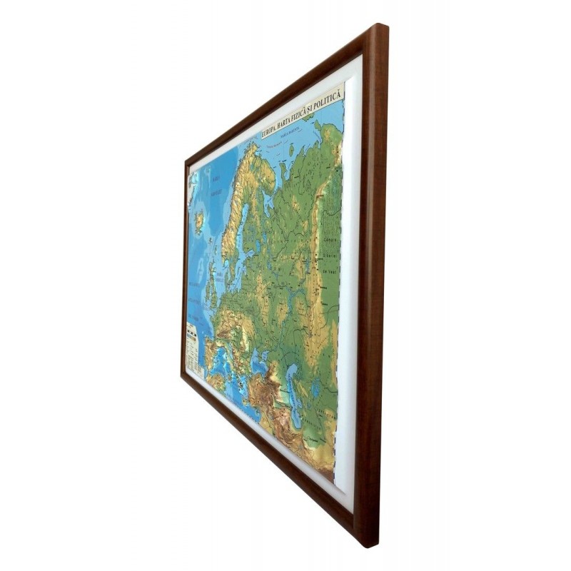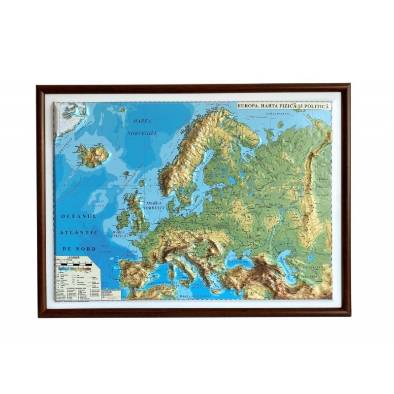 Harta reprezinta imaginea continentului european in relief, realizata in proiectie Mercator, in care paralele si meridianele se intersecteaza sub unghi drept. Produsul reprezinta un excelent instrument didactic pentru intelegerea formelor de relief, care sunt reprezentate diferentiat cromatic, precum si ca diferente de nivel.