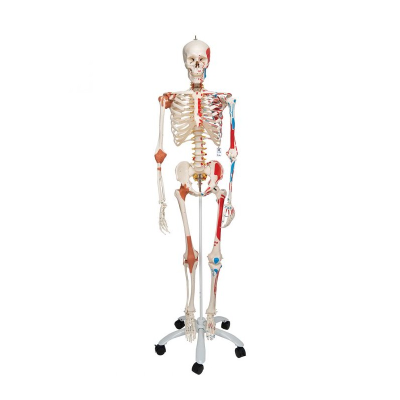 Scheletul Sam ofera toate avantajele unui schelet 3B Scientific. Cu ajutorul scheletului Sam, puteti demonstra, de asemenea, miscarile craniului prin articulatiile capului si, datorita coloanei vertebrale complet flexibile, puteti regla modelul pentru a-l aseza in posturi naturale ale corpului. Combinatia unica intre partile osoase si insertiile musculare, oasele numerotate, ligamentele flexibile si coloana vertebrala flexibila cu un disc alunecat intre vertebrele lombare a treia si a patra arata in mod clar interesul medical si anatomic al celor peste 600 de structuri ale acestui model de top. Schelet montat pe un suport metalic stabil cu 5 rotite.