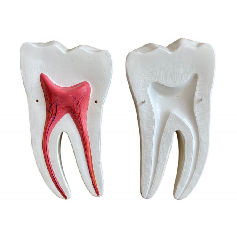 Modelul reprezinta un molar inferior gigant cu doua radacini, in sectiune axiala detaliind camera pulpara si canalul pulpar.