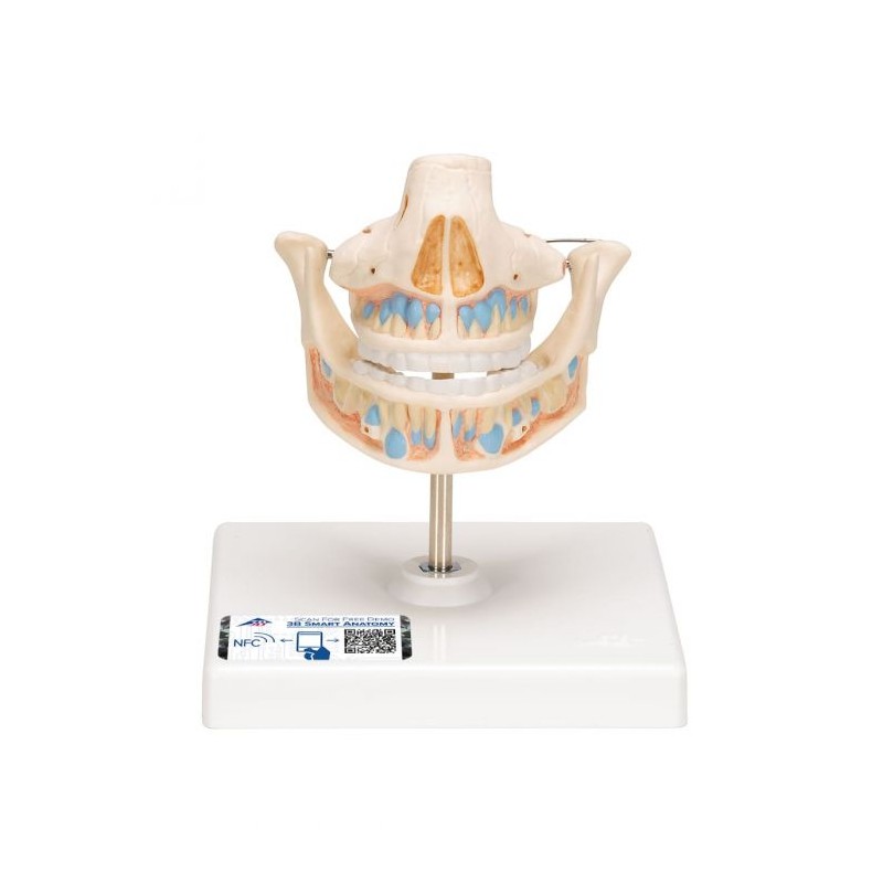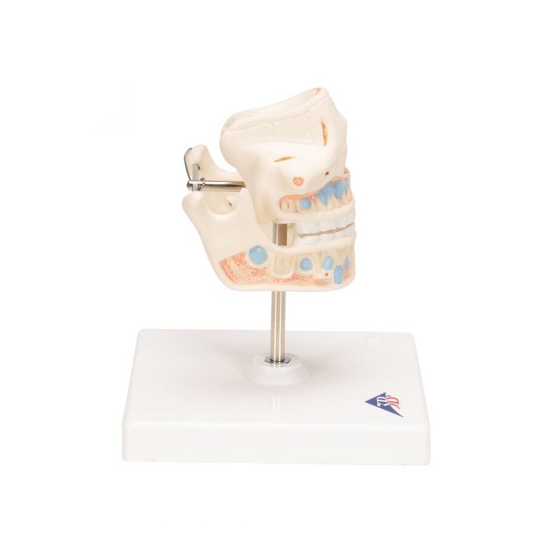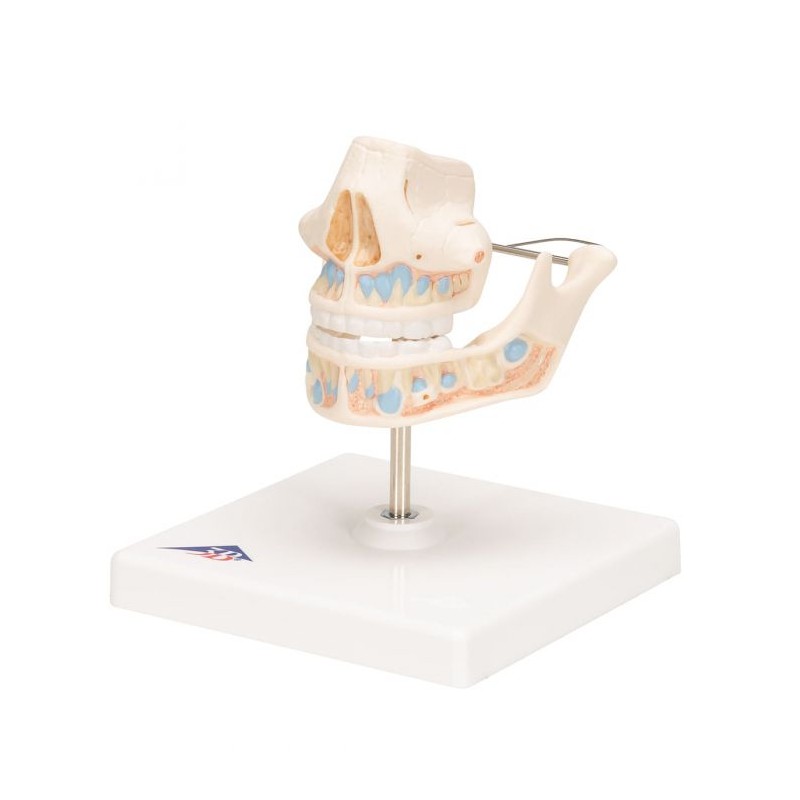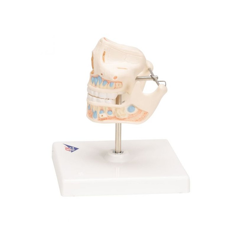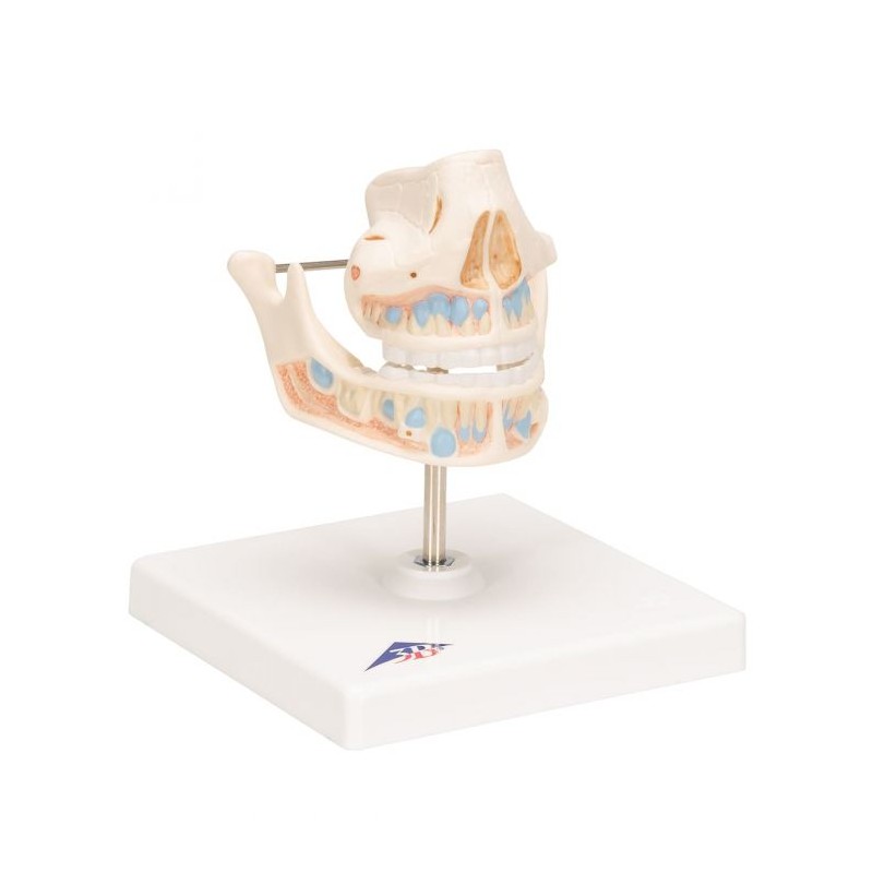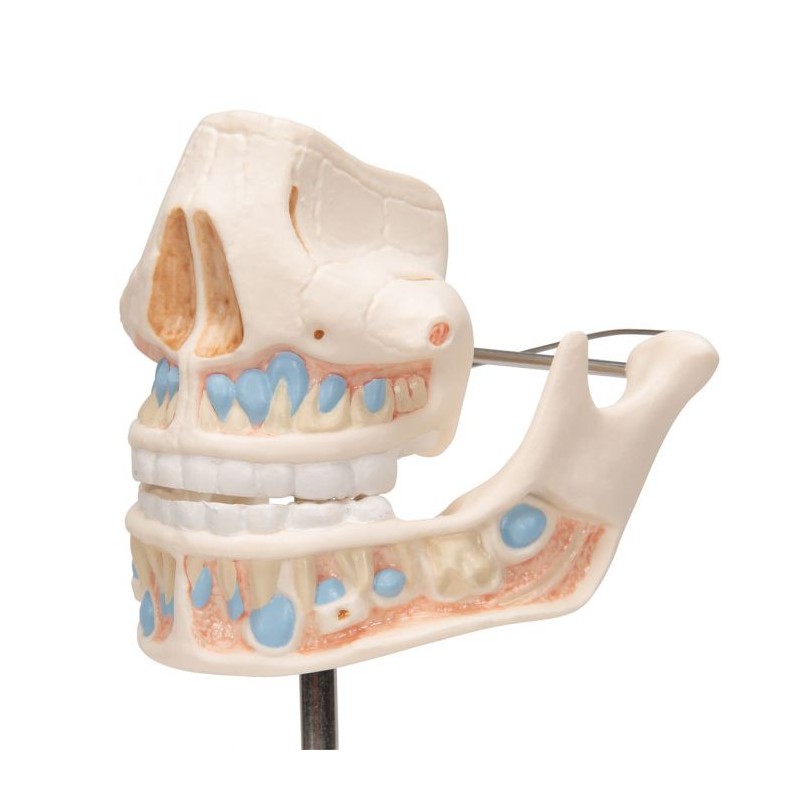 Modelul reproduce dantura unui copil, cu radacinile dentare, structura spongioasa a maxilarului si mandibulei, in care sunt ancorate vasele sanguine si nervii. Maxilarul inferior si cel superior sunt deschise.