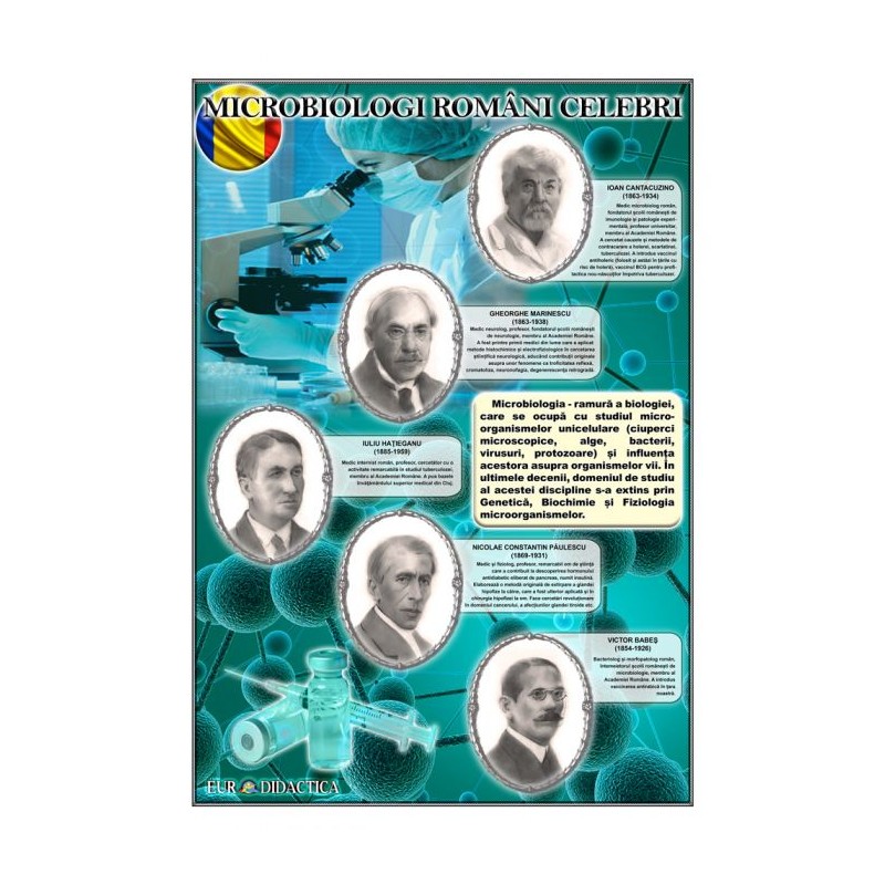 Plansa cuprinde portretele microbiologilor romani I.Cantacuzino, Gh. Marinescu, Iu. Hatieganu, N.Paulescu, V. Babes, cu o scurta prezentare a domeniilor de cercetare din cadrul microbiologiei in care au excelat.