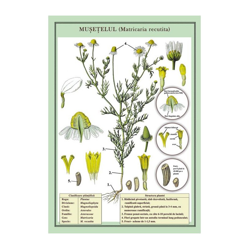 Plansa cuprinde clasificarea stiintifica si structura plantei, cu prezentarea detaliata a partilor componente.