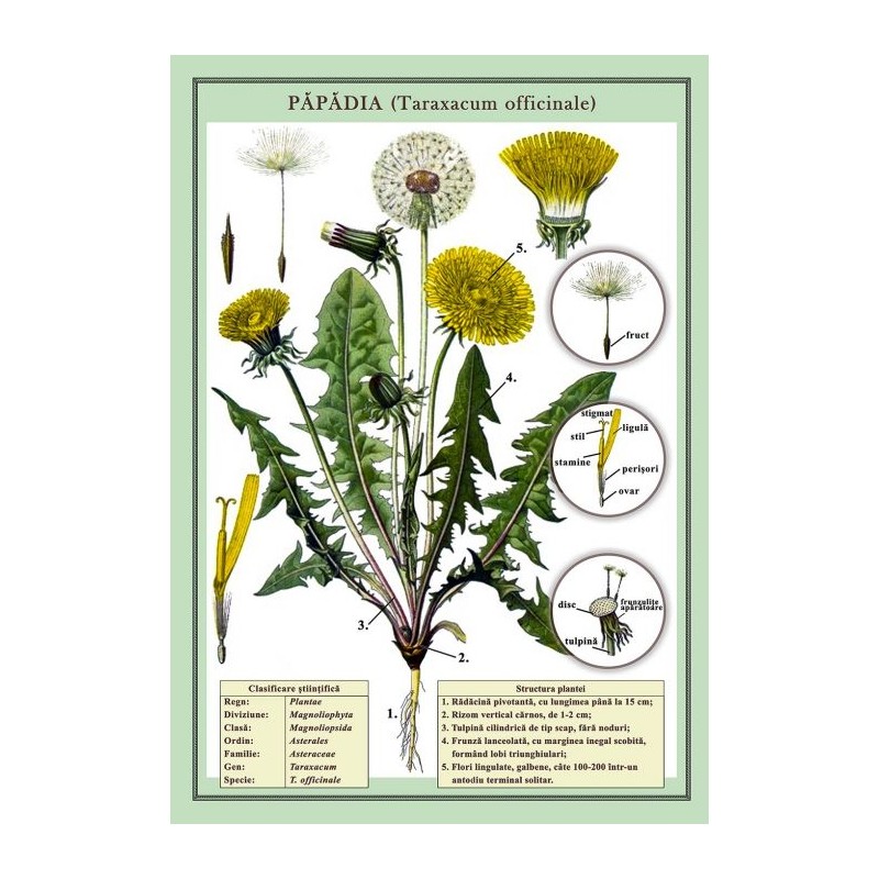 Plansa cuprinde clasificarea stiintifica si structura plantei, cu prezentarea detaliata a partilor componente.