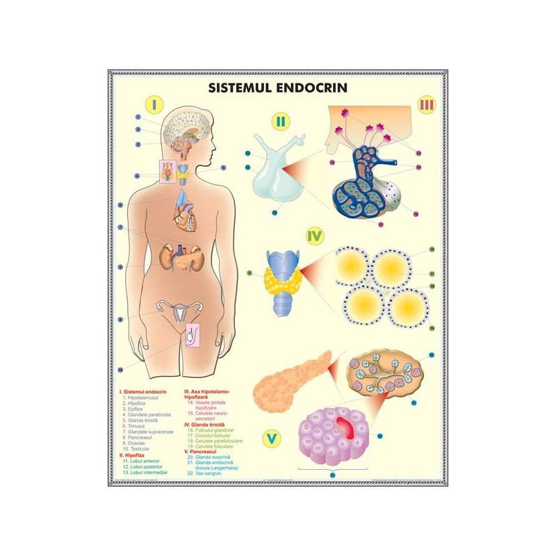 Plansa cuprinde 2 teme distincte, ordonate fata-verso: SISTEMUL ENDOCRIN (cu totalitatea glandelor endocrine, fiecare avand functii si structuri diferite: hipotalamus, hipofiza, tiroida, pancreasul); SISTEMUL DIGESTIV, cu prezentarea componentelor si a structurii detaliate a fiecarui organ implicat in procesul digestiv (dinti, stomac, ficat, vezica biliara, intestin subtire).