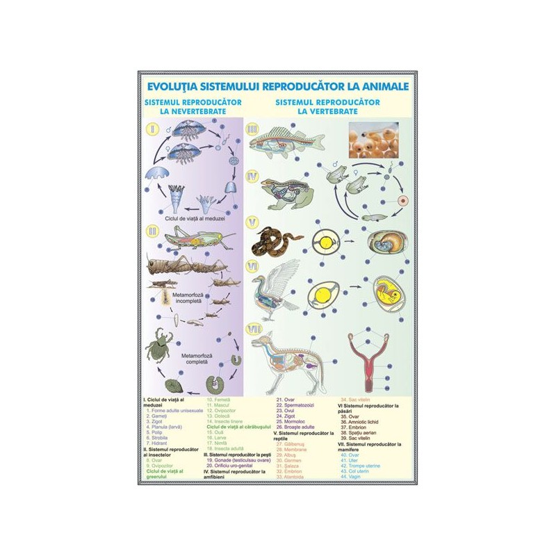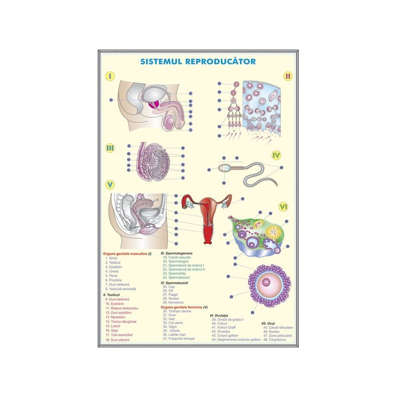 Plansa cuprinde 2 teme distincte, ordonate fata-verso: SISTEMUL REPRODUCATOR LA OM, cu prezentarea sistemului genital feminin si a celui masculin, precum si a fiziologiei acestora; EVOLUTIA SISTEMULUI REPRODUCATOR LA ANIMALE, cu detalierea sistemului reproducator la vertebrate si nevertebrate.