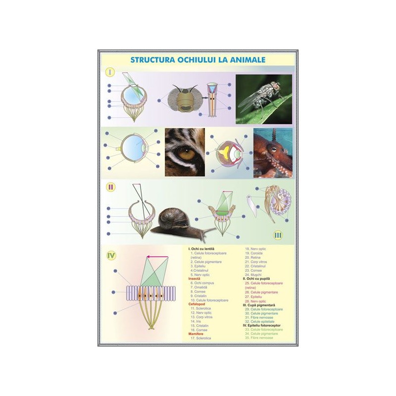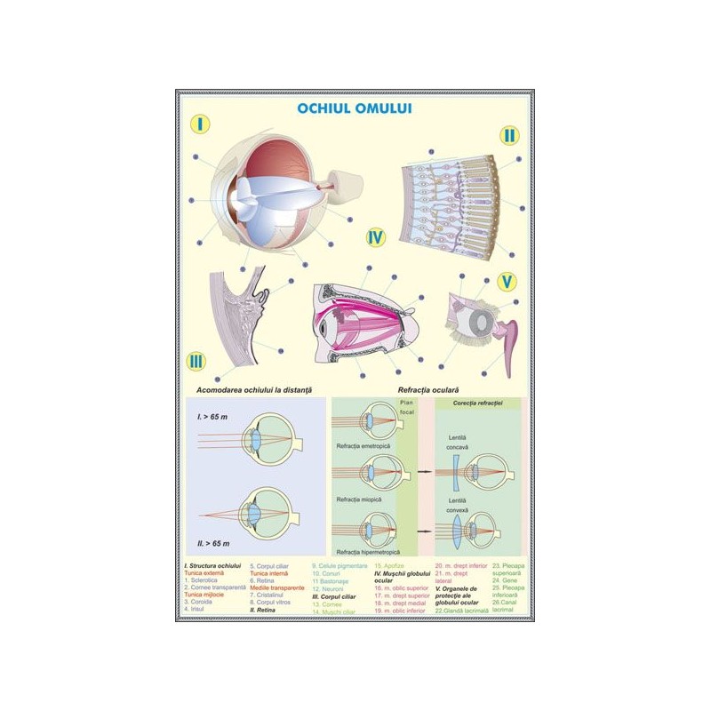 Plansa cuprinde 2 teme distincte, ordonate fata-verso: OCHIUL OMULUI, cu prezentarea detaliata a anatomiei si a functionalitatii fiecarui element; STRUCTURA OCHIULUI LA ANIMALE, cu explicatii pentru ochi cu lentila, ochi cu pupila, cupa pigmentara, epiteliu fotoreceptor.