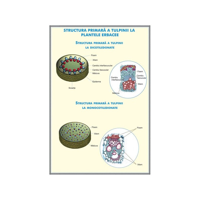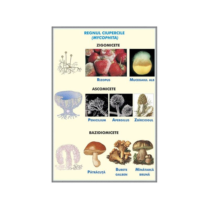 Plansa cuprinde 2 teme distincte, ordonate fata-verso: STRUCTURA TULPINEI LA PLANTELE ERBACEE, cu exemplificare pentru plantele de tip monocotiledonate si a celor din clasa dicotiledonatelor; REGNUL CIUPERCILOR, cu detalierea celor 3 clase de ciuperci (zigomicete, ascomicete, bazidiomicete).