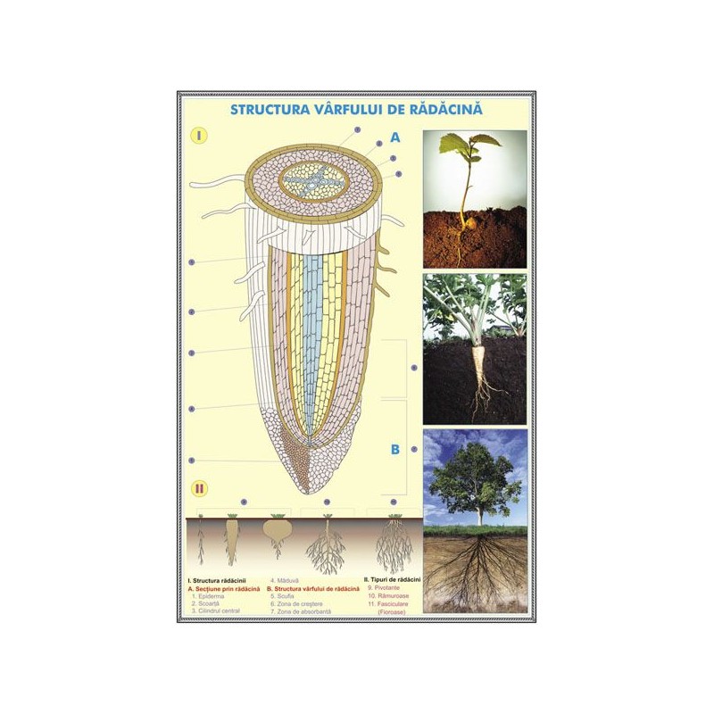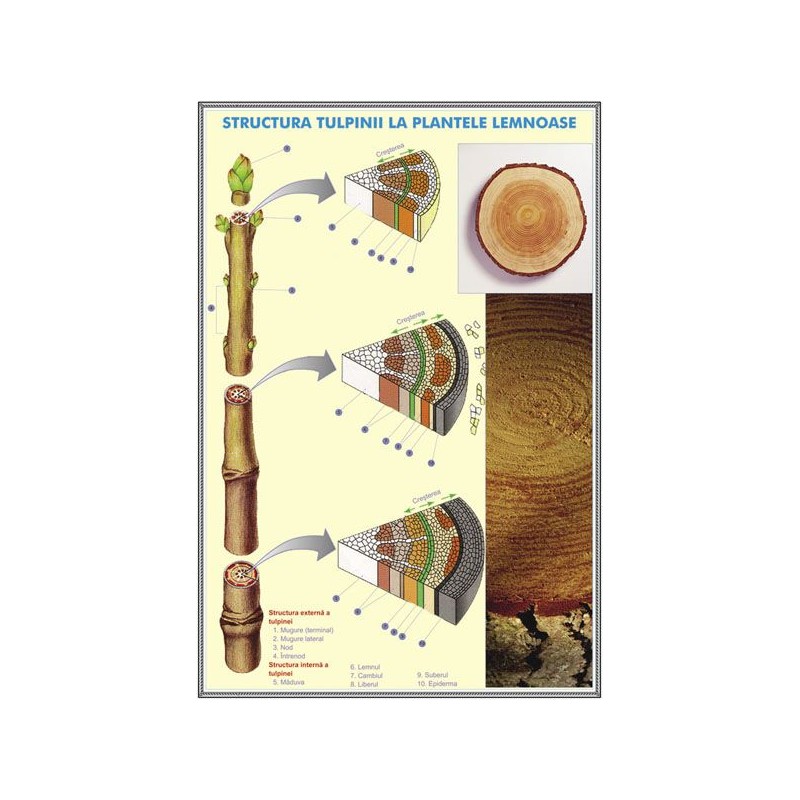 Plansa cuprinde 2 teme distincte, ordonate fata-verso: STRUCTURA TULPINEI LA PLANTELE LEMNOASE, cu analiza partii interne si a celei externe; STRUCTURA VARFULUI DE RADACINA, cu tipologizare radacinelor si prezentarea structurii varfurilor.