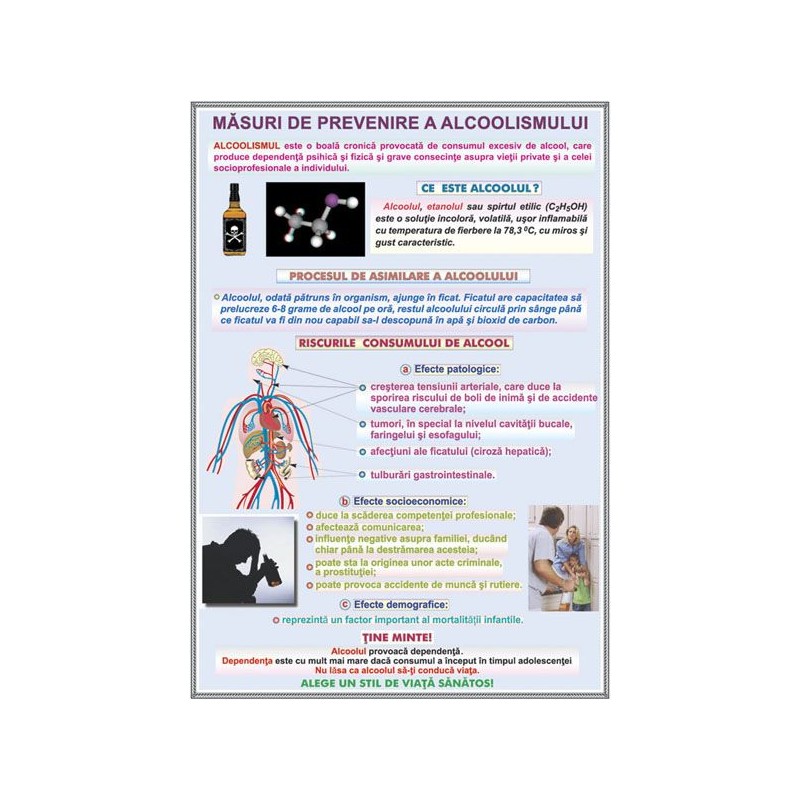 Plansa abordeaza problema consumului de alcool, prezentand riscurile acestuia pentru organismul si psihicul uman.