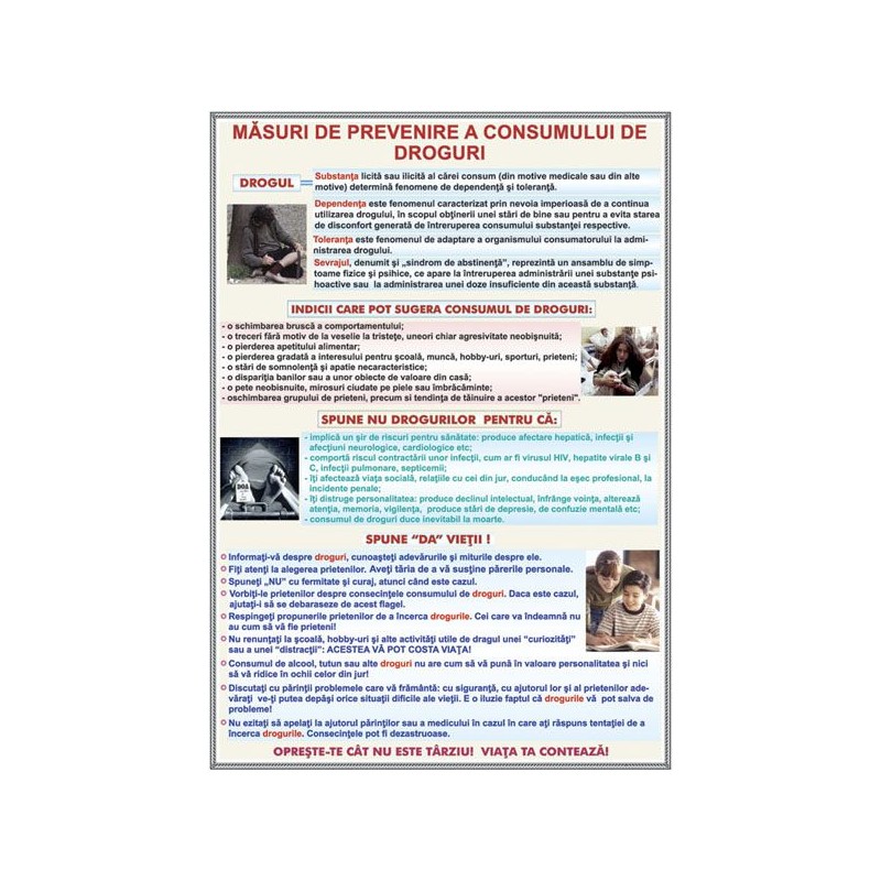 Plansa abordeaza problema consumului de droguri, punand accentul pe preventia acestui flagel si explicand urmarile consumului de droguri asupra organismului si a personalitatii individului. Sunt aduse in discutie 10 motive pentru care ar trebui sa spunem DA vietii.