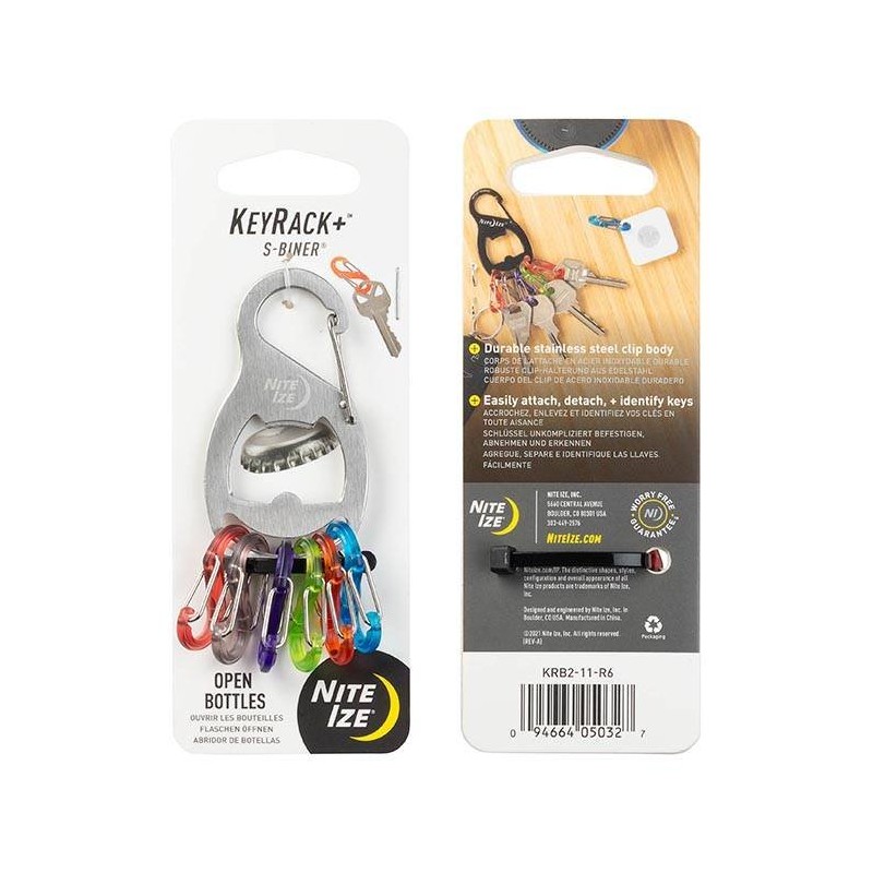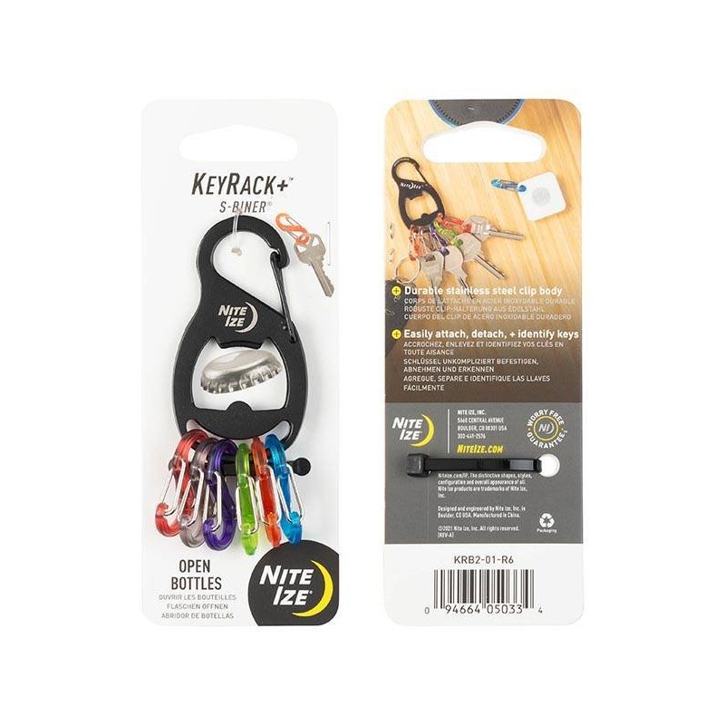 Carabina mare este fabricata din otel inoxidabil durabil, in timp ce cele mai mici sunt din plastic. Fiecare dintre micile S-Biners are o culoare diferita pentru a facilita identificarea de catre utilizator a cheilor. KeyRack + are, de asemenea, un deschizator de sticle incorporat.
