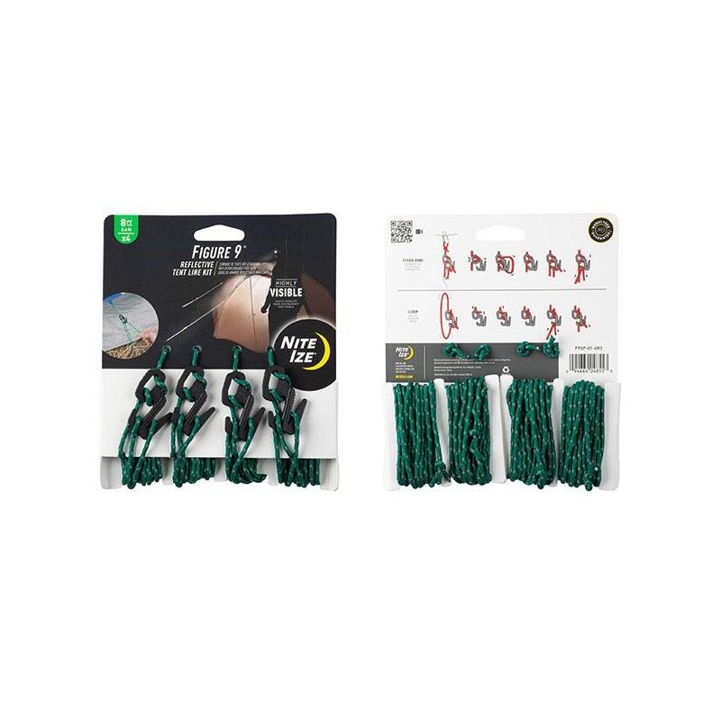 Kit de linii reflectorizante pentru cort cu dispozitive de tensionare Figura 9 de la Nite Ize. Prin intermediul unor tensoare special proiectate, amenajarea cortului sau prelata si reglarea lor, fixarea este foarte usoara si nu necesita noduri. Liniile reflectorizante in lumina slaba faciliteaza localizarea cortului si sporesc siguranta in campare.