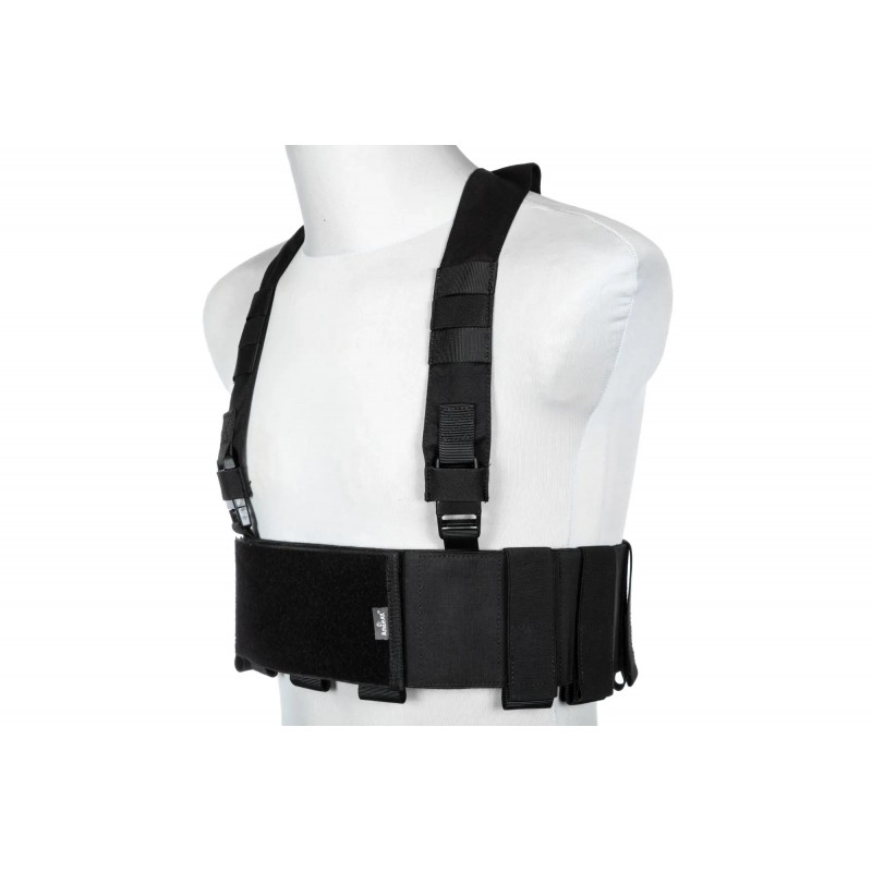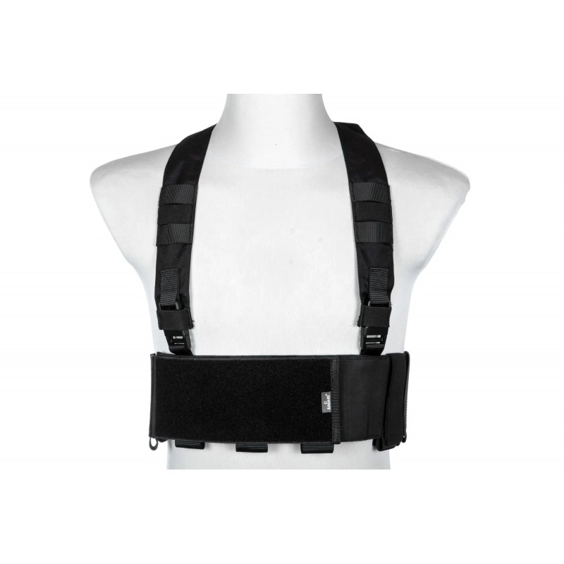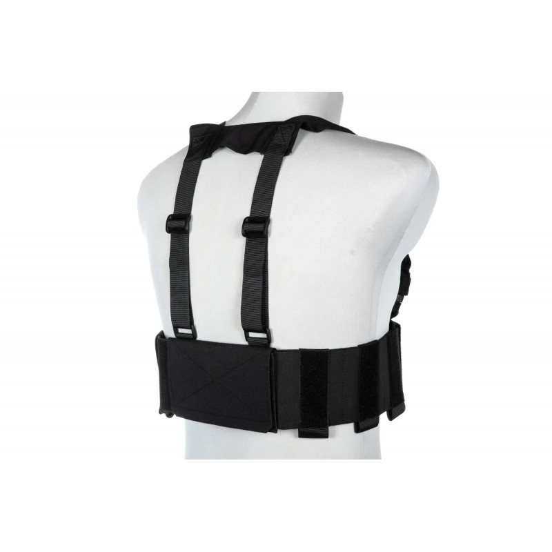 Vesta este reglabila prin intermediul panourilor Velcro care sunt situate in fata si in spate. Bretelele de tip H imbunatatesc confortul la purtare, pe care putem gasi si 3 sectiuni individuale de curele molle.